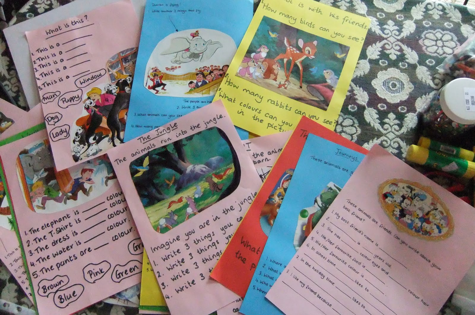 · We have started to make books and worksheets using pictures from magazines and asking questions about them, i.e. there are 5 people in this picture, how do they know each other, where do they live etc. etc. If you have any interesting pictures that could prompt a discussion then do bring that.